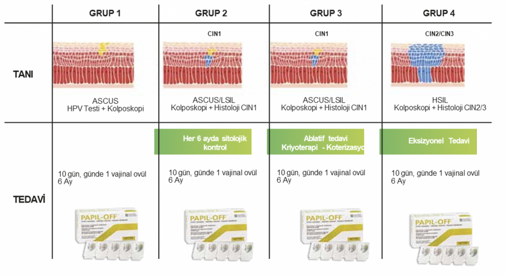 PAPIL-OFF™ Serviksin transformasyon bölgesini yeniden epitelize ederek, virüsün neden olduğu intraepitelyal lezyonları normalleştirerek, vajinal kuruluğu ortadan kaldırarak, servikal mukozayı yeniden epitelize ederek virüsün sebep olduğu lezyon riskinin önlenmesini sağlar.